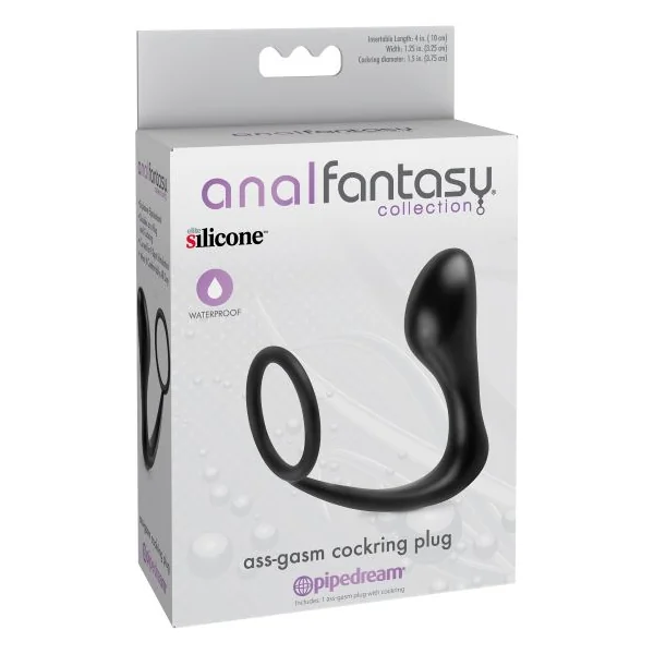 Anal Fantasy Collection Ass-Gasm Cock Ring Plug from Pipedream Products. Enjoy the most explosive ejaculations ever with the Ass Gasm Cock Ring Plug. Made entirely from silky smooth Elite Silicone, this wearable plug doubles as a performance enhancing cock ring, allowing the wearer to prolong ejaculation and extend the fun while enjoying incredible prostate stimulation. With the Ass Gasm in your ass and the ring wrapped snug around your cock, you will stay harder and stronger than ever before! The super stretchy Silicone ring puts the squeeze on performance let downs, maintaining firm erections that last and last! The round, smooth head makes entry and retrieval a snap, while the thin, tapered shaft ensures the plug will stay in place between your cheeks when the action heats up. Place the ring around the base of your cock and balls and wear it all day for long lasting fun and huge, powerful ejaculations! Ultra hygienic Elite Silicone is phthalate free, hypoallergenic, and super flexible. Clean up is a snap after the fun with Refresh Anti-Bacterial Toy Cleaner and warm water. Insertion length 4 inches, width 1.25 inches. Cock ring diameter 1.5 inches. Categories: Anal Toys, Small and Medium Butt Plugs, Probes, Sticks and Rods, Sex Toys for Men. No video. 2023.