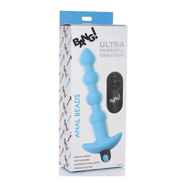 Experience the ultimate pleasure with the Bang! 28X Vibrating Silicone Anal Beads w/Remote Control in blue. Designed to elevate your intimate moments, these beads deliver powerful vibrations that tantalize and excite, making every use a thrilling adventure.Crafted from velvety smooth silicone, each bead is flexible, ensuring a comfortable experience for both beginners and seasoned enthusiasts. The tapered tip simplifies insertion, while the wide base guarantees safety during play. With a powerful motor featuring 4 speeds and 7 distinct vibration patterns, you can easily customize your pleasure. Plus, the rechargeable bullet vibe means your enjoyment won’t be interrupted by dead batteries, allowing for endless fun.Don’t miss out on this exquisite addition to your collection. Take control of your pleasure with the wireless remote and indulge in an experience like no other. Elevate your intimate moments and order your Bang! 28X Vibrating Silicone Anal Beads today.Product Details:• Choose from 4 speeds and 7 patterns of vibes to buzz your booty with each bead.• The powerful motor found in the bullet vibe is rechargeable for endless fun – simply insert the USB charging cable when the power runs low for endless fun!Enjoy each and every bead of this accessible anal toy with your favorite water based lubricant.• This sultry set of beads is perfect for anal training, improving your masturbation sessions, or for kinky couples who need a buzz in their butt while they perform naughty acts together.The IPX7 waterproof design of these Bang Beads makes it easy to play in the shower for some steamy anal fun, but also make it easy to clean when the session is over.