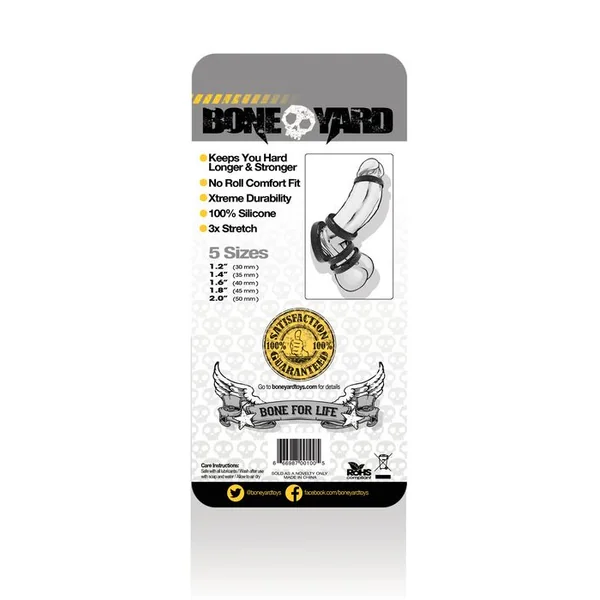 Boneyard Silicone Ring 5 Piece Kit Black. Five different size cock rings: 1.2 inches, 1.4 inches, 1.6 inches, 1.8 inches and 2 inches. Boneyard 5 pieces Kit Black. These must have man toys are designed with superior materials and production thus increasing both comfort and lifespan. The powerful and iconic Boneyard branded design has a sleek silicone finish and features a superior and durable 3x stretch. The soft medical grade 100% silicone rings and non-roll design provide a snug fit that both the wearer and his playmates will appreciate. Unique to themselves, these rings synergize with the wearer, providing endless comfort when wearing under your jeans. Ideal for stacking and perfect for stores to ensure customer does indeed obtain the correct size. You can be assured that they will withstand the punishment of your longest play sessions time and time again. The rings are packaged in a full-range 5 set kit for custom adjusting. They are also sold individually for multiple uses. Keep you hard longer and stronger. No roll comfort fit. Extreme durability. 100% silicone. 3X stretch. 5 sizes 1.2 inches (30mm), 1.4 inches (35mm), 1.6 inches (40mm), 1.8 inches (45mm), 2.0 inches (50mm). Care instructions: safe with all lubricants. Wash after use with soap and water. Allow to air dry. Bone for life. 17