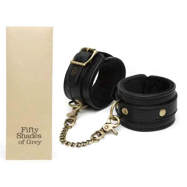 Indulge in your own Fifty Shades-inspired fantasy with these lavish ankle cuffs. Featuring plush padding and a velvety lining, these faux leather cuffs exude opulence with their antique gold finish, perfect for recreating Ana and Christian’s intimate adventures.