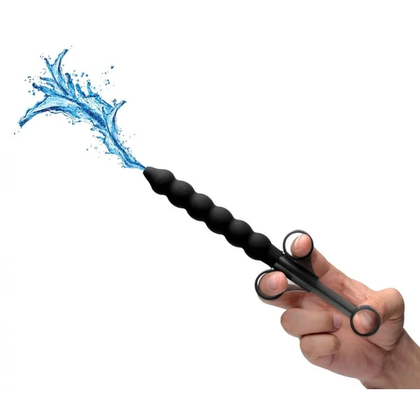 Cleanstream Silicone Beaded Lube Launcher from XR Brands. Deep lube application meets pleasure with this 6 bulb lube launcher! Enjoy every smooth, round bead as they push into your hole. This vaginal or anal accessory is designed for one handed ease of use. With the convenient finger loops you can fill the launcher with whatever liquid you want and inject with one simple thrust. The XL size holds over twice the amount of lube as our original size launchers, so you can get the job done with less steps! Made of premium silicone, this lubricant launcher is compatible with water based and oil based lubricants only. Do not use silicone lubricants. This non-porous and phthalate free material cleans easily with mild soap or toy cleaner. Measurements: 8.75 inches in total length, 5 inches insertion length, .9 inch insertable diameter. Materials Silicone, ABS plastic. Color Black.
