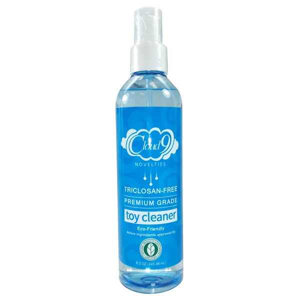 Cloud 9 Fresh Triclosan-free Premium Toy Cleaner 8.3 ounces. Eco-friendly Triclosan-free Premium Toy Cleaner Cloud 9 Premium Grade Fresh Toy Cleaner is a cleanser powerful enough to clean surface bacteria. It safely disinfects all personal products and is water soluble. Safe for all types of materials from plastic to realistic rubber on dongs. Keep your favorite pleasure products clean and safe with spray on cleaner. Our unique Cloud 9 agent gently cleans and protect, yet it it is mild enough to use every time. Packaged in a convenient pump spray bottle with a sealed cap. Ingredients: deionized H20, Natural Propanediol, Citric Acid. Made for Cloud 9 Novelties in the USA. Please note new bottle label 2021.