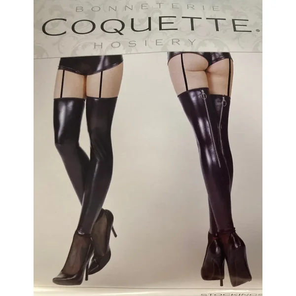 Add a touch of edgy glamour to your lingerie collection with these Coquette Wet Look Zipper Stockings. Made with a combination of wet look and mesh material, these stockings offer a unique and sexy look. The center back metal zipper adds a touch of convenience and a bold statement. Perfect for a confident and daring look.