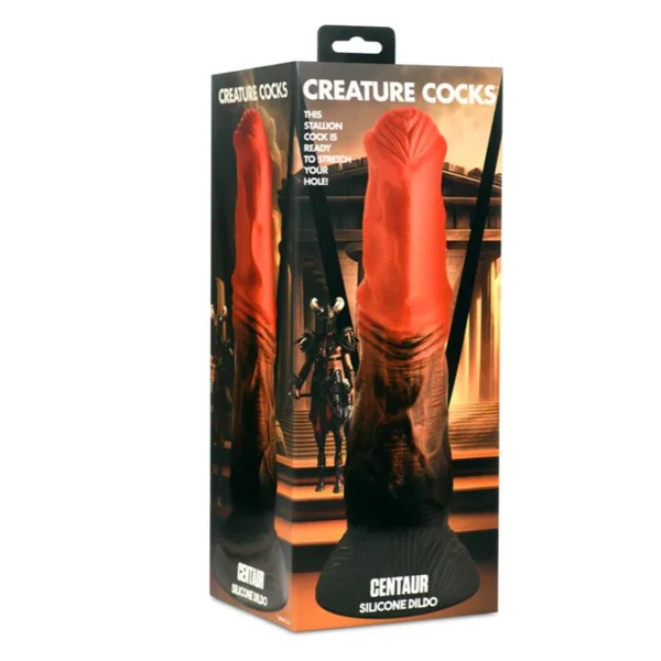 Get ready to ride with this Centaur dildo! This thick, long, horse-like rod is orange, copper and black. At the tip of the wide head are rings of foreskin that come together at a point to create a ridge along the shaft. At the center are wrinkled ribs where the skin bunches up along the massive length of this schlong. This meaty dildo has a girthy, long body that will stretch your limits! Made out of premium, flexible, phthalate-free silicone, this dong is body-safe and best used with water-based lubricants only. Enjoy hands free rides due to the strong suction cup base! Invite a partner to indulge in kinky cosplay or fantasy roleplay and use their favorite harness to transform this dong into a strapon! Afterward, make sure to wash it with warm water and mild soap, then spray it with a toy cleaner and air-dry. Keep out of direct sunlight and heat.You hear battle cries in the distance and begin to run. You decided to take the forest path between villages thinking it would be the safest. The war between the humans and centaurs had been going on for months now, but it had also blocked access to trade routes. It was up to you to find a new way to get from village to village so your people could survive. You weren’t a fighter and your village chose to not involve themselves in this foolish war, but you were one of the strongest and were sent to find a path. As you use a large knife to bushwhack your way through some of the thick vines and underbrush, thorns catching the skin on your legs and arms despite the leathers and cloth you wrapped around yourself, you hear something in the woods and pause. You crouch low, peering through the brush to look around. You nearly gasp when you see a lone centaur in the forest. His horse body is deep black with shades of auburn and copper. Where a horse’s head would be is a dark skinned warrior covered in armor and leathers, rippled with muscle, his black hair half braided and half loose. You barely breathe as you watch him pause and relieve himself. In the filtered forest sunshine you can barely help but stare at his massive rod, so heavy and long it nearly touches the ground. You swallow, look around, and begin to creep away as quietly as you can. It seems like a good plan until you catch your foot on a weakened tree stump and fall through it. Within seconds the centaur has galloped over and leaped on top of you! You reach your blade up and only manage to slice across his flank. He drops down to his knees and catches your arm with his spare hand, squeezing so tight you have to drop the knife. He grabs the knife before it falls and tucks it in his pack, out of sight. You’re unarmed and at the mercy of this giant centaur warrior. Trembling and anxious to survive, you realize there may be a way out of this you’ll both enjoy You relax your body, surrendering, and he lets go of your wrist. Slowly, cautiously, you slide your hands across his flanks, rubbing all those areas that he can’t reach, until you creep over to his hind quarters and slide your hands around his massive shaft. His eyebrows raise in surprise and interest. He almost stops you but you begin stroking him and his head falls back, his jaw drops and he moans. It must have been a long, long time since he’s had some attention so you give him as much as keeps him satisfied and peaceful. You want something, too. You’ve been hungry and curious to explore the taboos of sleeping with the enemy. Secretly you’ve been stretching your hole to take one of these giant rods if ever you got the chance. You shock both yourself and the centaur when you place it against your entry and then pop it inside! Both of you gasp and he nearly bucks in shock! Then you take the reins as you ride him from below until you’ve milked every drop of his horse seed!Measurements:Overall length: 10.4 inches.Insertable length: 9 inches.Narrowest insertable diameter: 1.8 inches.Widest insertable diameter: 2.6 inches.Materials: SiliconeColor: Orange, Black, CopperNote: Do not use with silicone lubricants.
