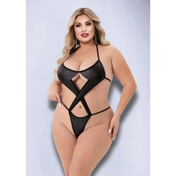 Turn up the heat with Baci’s wetlook black teddy, crafted from 100% polyester for a sleek, form-fitting finish. This bold piece leaves little to the imagination, with criss-cross straps forming a daring X across the torso for a seductive, barely-there look. The back features an open design with a single, simple strap that ties to secure the fit, enhancing both comfort and allure. With its plunging neckline and teasing straps, this teddy is the ultimate choice for a night of confidence and intrigue.