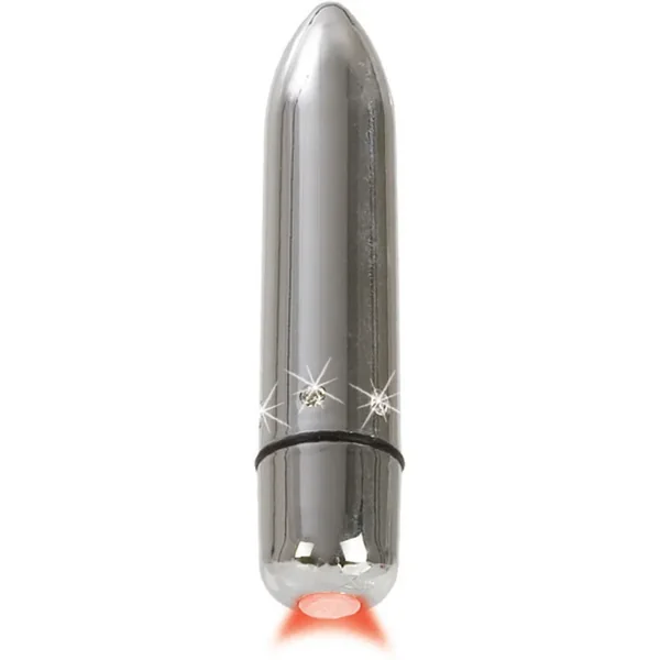 Smooth, seamless, and discreet bullets adorned with fine white crystals. Incredibly intense power. Whisper quiet. New incremental speed control. Luminous light. Instant off feature. ABS with metallic plating. Battery included (1 N). 2.5″x .6″/ 6 cm x 2 cm.