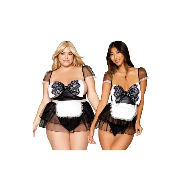 This maid-themed mesh babydoll captivates with its open cup design, adding allure to the ensemble.