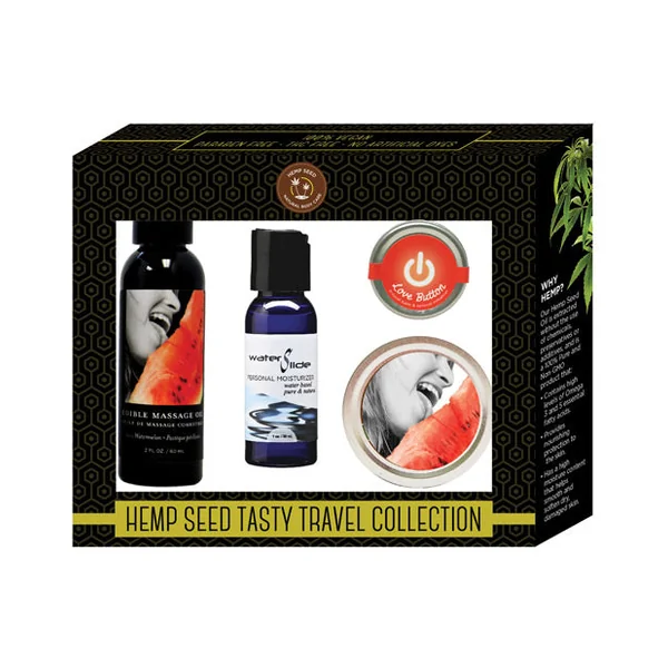 Collection contains watermelon fragranced 2 oz edible massage oil, 2 oz edible 3 in 1 massage candle, 2 oz Waterslide & Love Button arousal balm.