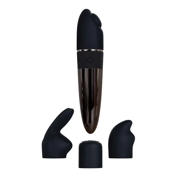 Four hot sensations in one versatile 7-speed vibe! tease your clit with each unique slip-on silicone cap that makes this powerful toy into a multiple “O” pleaser. Try the nubby fin that burrows ins way into any crevice, or the angled lipstick shape that presses all the right buttons with it flat raised circle. Maybe you want busy bunny ears that won’t stop bopping? Or a tickler top for an unexpected tingle? Pick a new feeling every time! Or turn the vibe around to play with the smooth tip for a classic touch. This rechargeable mini-vibe kit is completely submersible and easy to clean.