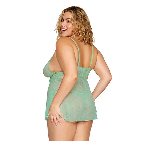 Eyelash lace and dot mesh babydoll and G-string setDelicate gold chain and butterfly charm neckline detailTriangle soft cups with adjustable shoulder strapsAdjustable bodice shirring with ribbon ties