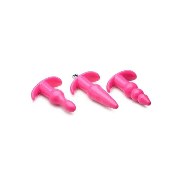 A simple but comprehensive set for the anal curious, this 4 piece kit includes a classically-shaped plug, a smoothly-bulbed design, a ribbed style reminiscent of anal beads, and a one-speed bullet vibe that slips easily into all three of them. Each plug is sleek, with just the right amount of give, and tapered for your comfort. Just slide the petite peanut vibrator into the base of the plug you wish to play with, whether you feel like a classic shape, an exciting bulge, or three pops of pleasure. The easy-to-use button operation makes playtime hassle-free and the contoured bases keep each plug safely and comfortably in place between your cheeks. This firm, yet flexible material is phthalate-free and compatible with water-based and silicone lubricants. The bullet is even waterproof for easy cleaning or use in the shower.