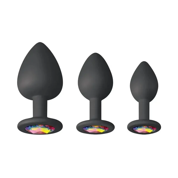 Enjoy backdoor bling with Glam’s three-piece set of bejeweled silicone plugs. Elegantly crafted, each is shaped for comfort and fun and adorned with a sparkling rainbow gem. Suitable with all lubricants.