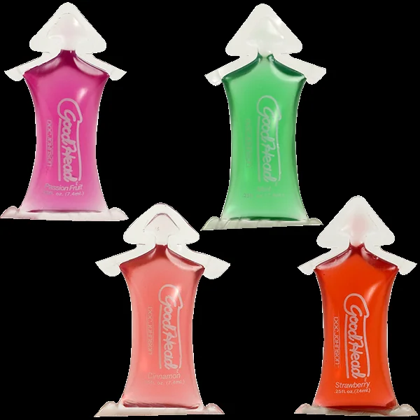 Goodhead Mini Packs with Fishbowl Display. Five assorted flavors: Cherry, Cinnamon, Strawberry, Passion Fruit and Mint. Convenient pillow packets of GoodHead oral sex gel. Just put your lips together and blow with Doc Johnson’s GoodHead gel. Try for yourself and see how this edible blow job enhancer makes your foreplay unforgettable! Comes in strawberry, mint and cinnamon flavored gels that will give your good times some tasty variety. Traditional tasty good head in .25 ounce mini packs discreetly head out with these. Ingredients: Acesulfame K, Artificial Flavor, Propylene Glycol, Diazolidol Urea, Di Water, Glycerin, Algin, Methyl Paraben, Propylparaben, FD&C #40. Lotions/Potions & Aphrodisiacs. Goodhead Mini Packs with Fishbowl Display from Doc Johnson Novelties the Great American Toy Company.