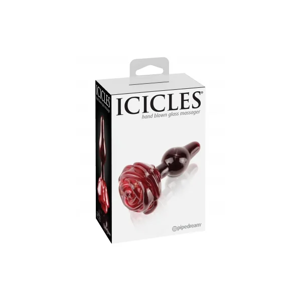 Icicles No. 76 PD287600. Elegant, upscale, and hand crafted with amazing attention to detail, this luxurious line of glass massagers will leave you breathless. Each hand blown Icicle glass wand is sleek, unique, and made to play hard. The hypoallergenic glass is nonporous and body safe, and when cared for properly, is designed to last a lifetime. Run the wand under warm water or place it in the microwave to heat things up. Chill it under cold water or put it in the freezer for a cool sensation. Since glass is nonporous, cleanup is a snap. Use Pipedream Toy Cleaner and warm water, or put it in the dishwasher for a worry free wash after the fun. Amazing for temperature play, sleek and super smooth, unique and hand crafted, non-porous, body safe and hypoallergenic. Red glass plug features a smooth small tapered head, followed by a slender neck, and a bubble followed by another slender neck the end is shaped like a rose to prevent toy getting lost up there. Plus helps with easy use and retrieval. Insertable length 2.5 inches, width 1.3 inches.