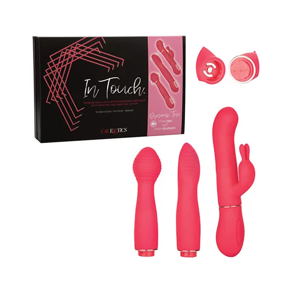 Made to fit your pleasures, In Touch Dynamic Trio is a versatile vibrator set with 3 dynamic attachments that pulsate to the rhythm of 10 functions of vibration and 3 times the pleasure. This sensual vibrator is perfect for beginners and erotic experts alike with 3 thrilling attachments. Deliver knee-shaking stimulation with the Teaser’s 10 functions of vibration. Thrilling even the naughtiest with the G Bunny’s dual motors and 10 functions of synchronized vibrations and shaft rotations. Whisk yourself away to a wonderland of passion while the Charmer delivers 10 functions of synchronized vibrations and shaft rotations. The seamless button controls up 70 minutes of vibrating pleasure. Charge up your passion in only 1.5 hours with the provided USB cable. The ultra-plush silicone body and base allow the silky massager to move with your body. The smooth contoured stimulator shapes and supple surface lets you deliver sensual vibrations from any angle of this sensual vibe.