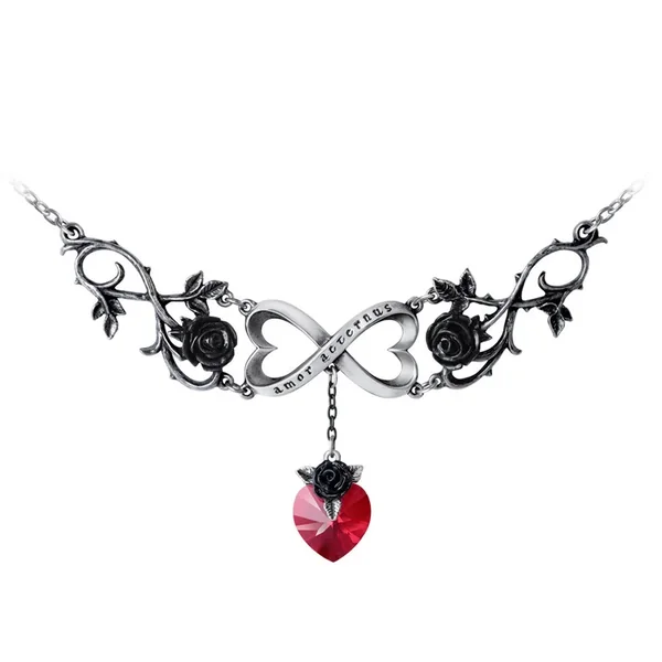 A three section, articulated pewter necklace with a polished, double heart-shaped knot of infinity at the center and a woven black rose motif on either side. From the central section hangs a deep red Swarovski crystal heart, suspended on a fine black chain terminating in a black rose bale.