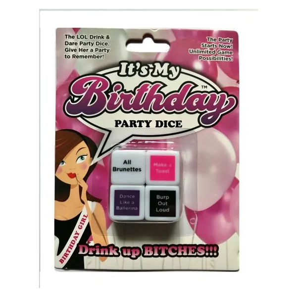 Its My Birthday Party Dice Game from Ball and Chain Fun. Drink up bitches. Drink & Dare Party Dice Game. The party starts now! Unlimited game possibilities. Give her a birthday to remember!Creating an unforgettable event begins right here! It is her birthday and there is no better way to create an unforgettable event then with our Its My Birthday party dice. Take turns rolling the dice to create hilarious dares that will have you and your friends, laughing, drinking and partying all night long.How to play: Birthday Girl rolls first, rolling all four dice together. Once rolled, follow the instructions that correspond with the roll of the dice, lightest to darkest. For example, the Birthday Girl, will TAKE A SIP, USE A FOREIGN ACCENT and then SPANK GUYS BUTT. Once the dares have been performed (and witnessed by all) the next player (on the left) will roll the dice and so on. Please drink responsibly. 19 new package image.