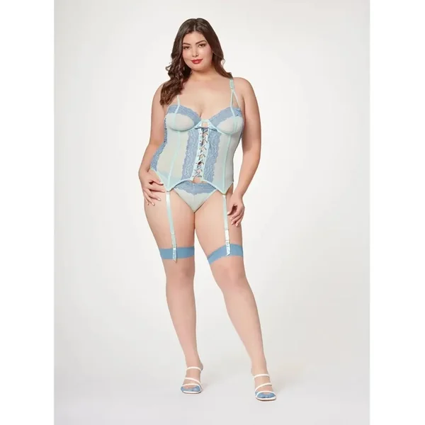 Lace and mesh bustier with lace up center front detail, adjustable garter straps and matching thong panty, all with gold hardware.
