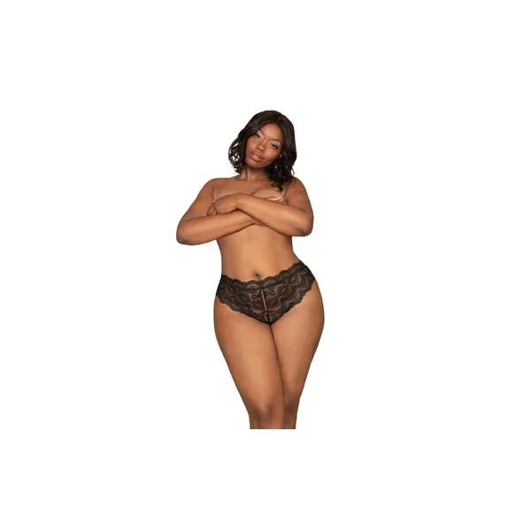 Lace tanga panty with elastic open back detail.