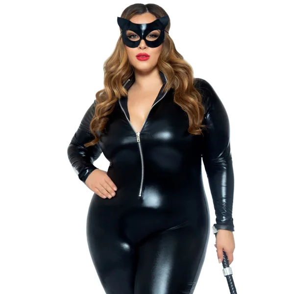 The Leg Avenue Lame Zipper Front Catsuit is made to take your DIY costume form forgettable to fierce! This wild wet-look catsuit gives off major femme fatale vibes with the sleek faux leather, plunging zipper front and full-length pant. The scandalous bodysuit adds major sex appeal to any costume with a stretchy, curve hugging fit. From charming comic book criminals to blockbuster beauty heroines, this wet look bodysuit is the perfect costume basic to embody your favorite comic universe characters. For a daring dark widow look, pair the black cat suit with Leg Avenue Long Wavy Wig in Burgundy, Multi-Strap Garter Pocket Utility Belt and Double Gun Zipper Holster. No matter how you style this sexy suit, this faux-leather bodysuit is perfect for Halloween parties, rave festivals, comic conventions or DIY cosplay.