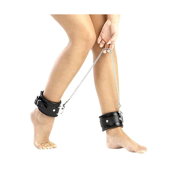Leather ankle cuffs, padded and edge-trimmed. Connected by heavy-duty curb chromed curb chain.