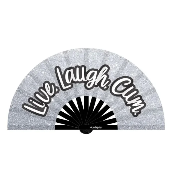 Cool yourself in style with this Live, Laugh, Cum large-sized folding hand fan. The glittery silver design is colorful and fun with just the right attitude! Made of glossy bamboo ribs and high-quality satin material.13H x 24.5L x 0.75W (unfolded)Glittery Silver SatinGlossy Bamboo Ribs