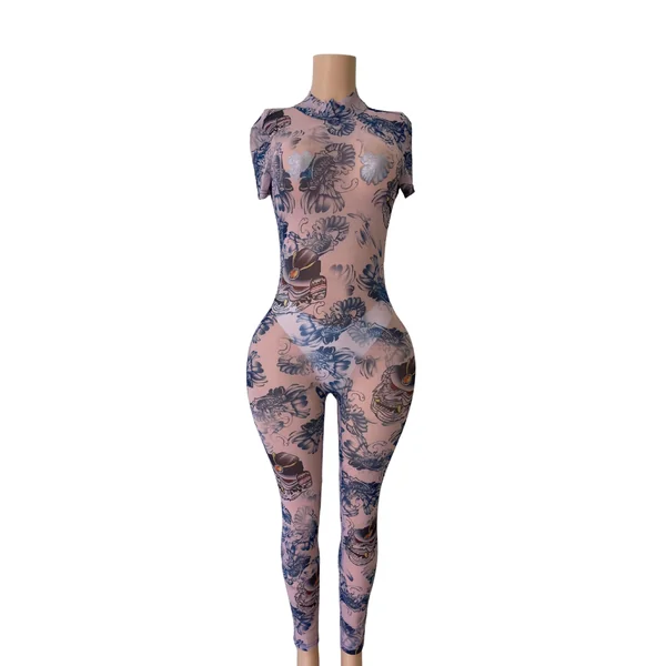 Elevate your style with the Long Tattoo Mesh Jumpsuit #001, designed for a bold, confident look. Crafted from sheer mesh with intricate tattoo-inspired patterns, this jumpsuit contours your body while offering breathability and flexibility. Its long sleeves and full length provide elegant coverage, making it perfect for striking statement occasions or layering with other pieces. This garment combines edgy design with comfort, ideal for those seeking a blend of sophistication and daring fashion.