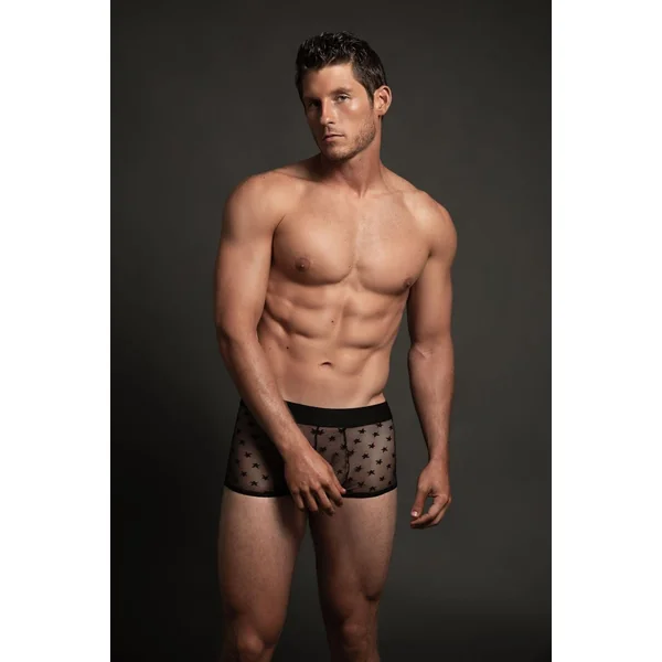 Tight-fitting sheer boxer with an all-star motif. It features an elastic waistband, elasticized thighs and a full mesh back.