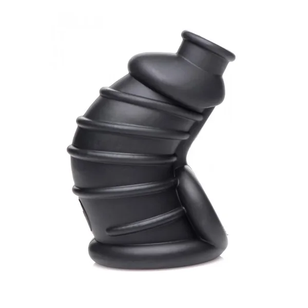 Master Series Dark Chamber Silicone Chastity CageConfine his cock in this Dark Chamber! This Silicone Chastity Cage is soft flexible and velvety for a more forgiving lock-up compared to metal and plastic chastity cages. The Dark Chamber features a soft skeleton of slightly firmer silicone for that authentic cage feel but still moulds with your body for comfort during wear.Designed and constructed with premium velvety silicone for a comfortable caging! The Dark Chamber features a cum thru tip for easy relief during wear making this comfy cage perfect for extended chastity scenes for beginners and experts.Unlike cages made from plastic and metal the silicone material is travel friendly and discreet. The flexible nature works with your clothing rather than against it so you can go about your day protected without a large bulge in your undergarments! This cage is held in place thanks to a snug cock and ball opening.Measurements: Overall length 4 inches cage opening diameter (unstretched) 1.7 inches ball strap opening diameter (unstretched) 0.8 inchesMaterials: SiliconeColour:Black