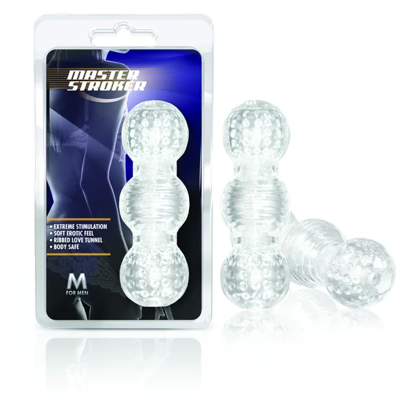 Blush Novelties M For Men exclusive toys for big boys. High quality luxury adult toys for every body type and feel. Blush Novelties exclusive product line will blow you away. Master Stroker Clear make it thicker, longer and stronger. The Stay Hard Master Stroker is a stretchy male stroker accommodates all shapes and sizes. Step 1 stimulate, step 2 insert and step 3 stroke. Repeat step 3 for erotic release! Three different pleasure bubble compartments. Each compartment features an individual texture for extreme stimulation. Stroking can be a visual simulator for you or your partner. Watch as your erection swells and pulses inside the translucent compartments. Master Stroker is made of phthalate free and skin safe Elastomer. It is easy to clean. Specifications: textured chambers for intense stimulation. Snug fit. Made from pure body safe Elastomer. Phthalates and Latex Free. Length: 5.9 inches. Insertable length: 5.9 inches. Width: 1.9 inches. How to use video available. Prepare apply lube to penis and masturbator. Motion insert penis into masturbator. Cleanse and care turn inside out run water and apply a mild soap or wipe with a choice toy cleaner, then let air dry. Category: Masturbators. Master Stroker Clear from Blush Novelties. UPC 735380613129. Product Package Dimensions: 8 inches H by 4.5 inches, 2.25 inches D. Product Packaged Weight 4.5 ounces.