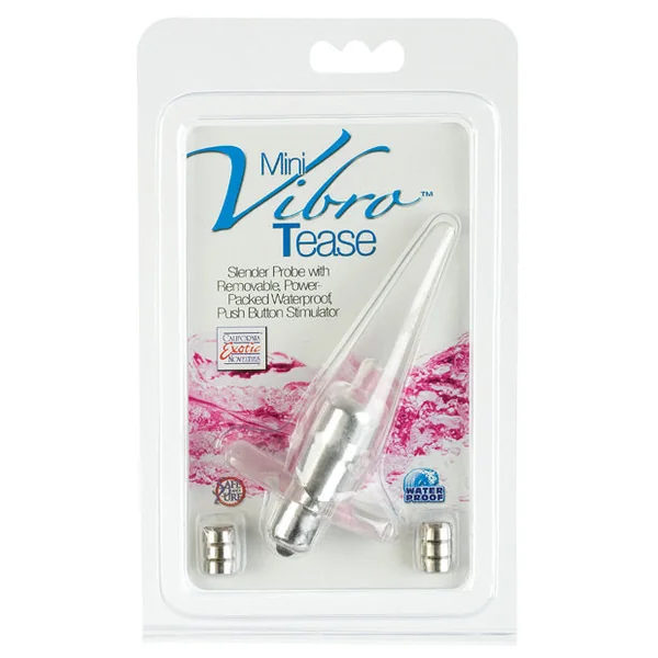 The Mini Vibro Tease from Cal Exotics is a slender probe with removable, power-packed, push button stimulator. Batteries included (3 watch, 6 included). 4″ x 1″.