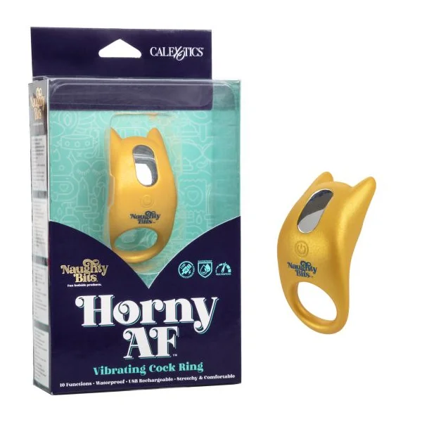 Get In the Mood With the Naughty Bits Vibrating Cock Ring! This stretchy and comfortable vibrating enhancer ring is made to thrill with 10 functions of vibration and teasing nub shape. The powerful pleasure ring is perfect for blushing beginners or erotic experts looking to turn the heat up. The luxurious Silicone ring works wonders to maximize stamina and increase girth to make your lover moan for more. Increased blood flow means sensitivity throughout the penis increases as well, letting men enjoy longer, more powerful pleasure. This vibrating ring will always leave your lady in a state of breathless bliss. Ladies, while his pleasure increases, so will yours! The ergonomically designed stimulator and nubby teasers pinpoints intense vibrations on sensual sweet spots. Use the easy touch control button to effortless increase intensity for an organically good time. Take this waterproof ring for a dip and embrace those powerful vibrations in the bath, shower or hot tub. This astonishing ring knows exactly what you want by using a state of the art memory chip to pick up on the last function used. Use the sleek profile easy touch silicone buttons to effortlessly control pleasure. Get back to playtime in no time with a charge time of 1 hour. SKU SE441057. Color Gold. MaterialsSilicone, ABS Plastic, Metallic Plating. Power sourceUSB Rechargeable, included. FeaturesPhthalate Free, Waterproof, Rechargeable, Vibrates. 1 year warranty. Maximum run time 80 minutes. Maximum charging time 60 minutes. Measurements 3 inches by 2.5 inches Enhancer. 1 inch ring diameter. Bulk weight 2.6 ounces. Package 5.1 ounces. Package 2 inches by 4.5 inches by 8.25 inches.