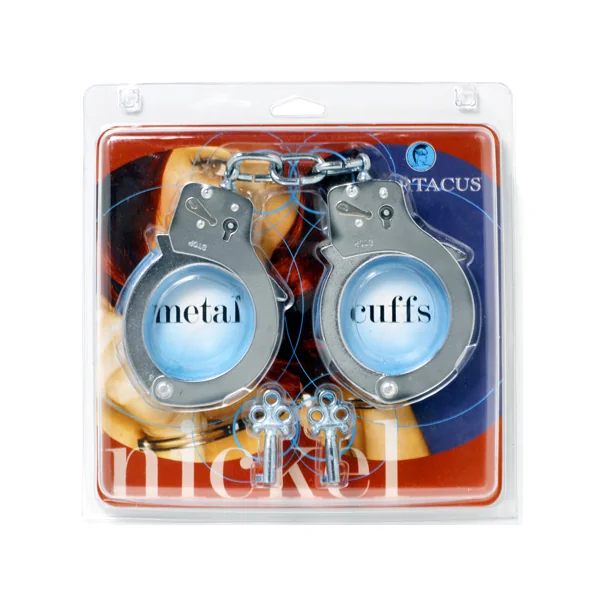 Bondage Gear handcuffs. Metal handcuffs. Nickel coated steel. Spartacus handcuffs are available in dual locking and single locking. Single lock handcuffs in silver. When it’s time for tough love, handcuffs can turn an ordinary encounter into an erotic fantasy. Dual lock handcuffs in black or nickel finish. Each sold separately. Handcuffs come with 2 release keys. Always establish a code word for stop. Issue keys to both partners. Play responsibly. Spartacus A Passion For Quality page 44.
