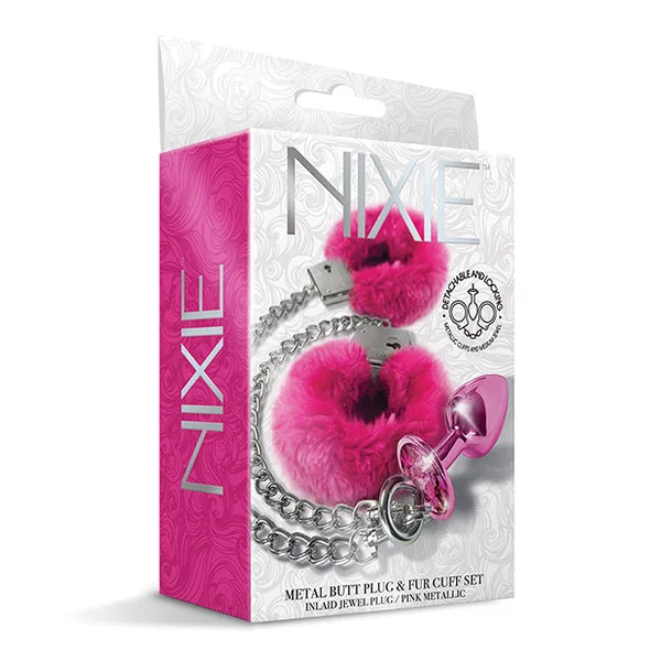 Nixie Metal Butt Plug W/inlaid Jewel & Fur Cuff Set – Pink Metallic