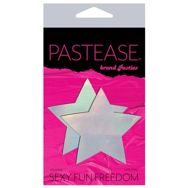 Hand-Made in the USA of durable, waterproof, holographic pleather materials that resist wrinkling over hardening nipples. Conceal or Reveal with Pastease nipple pasties when worn with a sexy outfit, daring bikini, sheer top, revealing dress, Hefty bag, body lotion, crazy costume, party theme or nothing at all! Peel & Stick, Medical-Grade, Latex-Free, Waterproof Adhesive for hours of Sexy Fun Freedom in most any condition, indoors or out. Leaves no sticky residue and gently peels away at the end of use. Dimensions: 3 inches X 3 inches. Coverage Diameter: 1.55 inches. Silver Hologram Star.