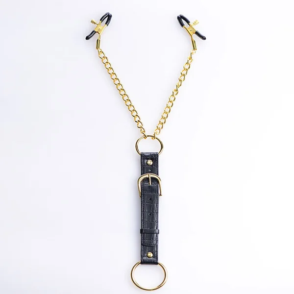 Once applied, the cock ring will make sure that they maintain a longer-lasting erection. Next, apply the alligator-style nipple clamps and adjust the pressure screw. As he uses his enhanced erection on his partner, the thrusts and strokes will tug on the nipple clamps giving him sensations both above and below the waist. The cock ring is held by an adjustable leather strap.