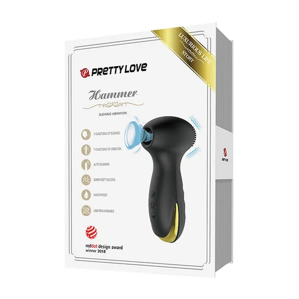 Pretty Love’s Hammer boasts vibration and suction functions, representing next-generation novelty products. The inspiration comes from the passionate experience of kisses between couples. It provides customers with three attachment options. We independently developed the mini air suction pump and safe battery, making the Hammer more portable, safe, and its ergonomic design makes it easy to use. 7 suction modes and 7 intense vibration modes bring customers various sensual experiences. Portable charger and low-noise design allow you to use it anywhere. Pretty Love’s Hammer’s IPX7 waterproof design makes it easy to clean.7 sucking functions. 7 vibration functions.Material: Silicone. Zinc Alloy. USB rechargeable.Dimensions:Overall Length – 5 inches.Overall Width – 1.65 inches.Width of Air suction part – .70 inch. One Year Manufacturer Warranty.