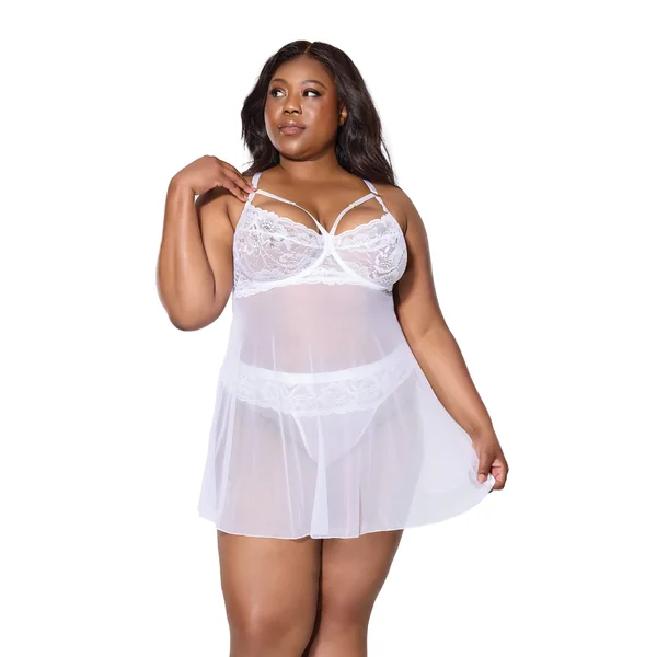 Scallop Stretch Lace & Mesh Babydoll w/Thong – White 1X/2X