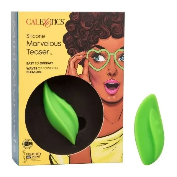Put some magic in your fingertips and indulge of waves of pleasure with the playful Mini Marvels Marvelous Teaser. The silky smooth vibrating hand massager fits right between your fingertips to let you easily control the 100% play area and 10 indulgent vibration, pulsation and escalation functions. The unique leaf shaped body has a smooth shape and supple surface, perfect for use as a powerful clitoris massager or to deliver thrilling stimulation from almost any angle you choose.An easy-touch 2-button control lets you cycle through the knee-shaking settings or use the secure travel lock feature to take your passion to-go. Recharge the premium silicone vibrating massager in 2.5 hours with the provided USB charging cable to enjoy 50 minutes of high-speed stimulation or 4 hours of low speed vibrations. While the easy-touch button controls the intensity and the vibe gives you the stimulation you want, the integrated state of the art memory chip remembers just how you like it by starting on the last function used. The self-sealing charging port and virtually seamless body let you get steamy in and out of water with this waterproof mini. The hypoallergenic premium silicone is body safe, unscented and phthalate free to keep you most sensitive spots, happy and healthy.