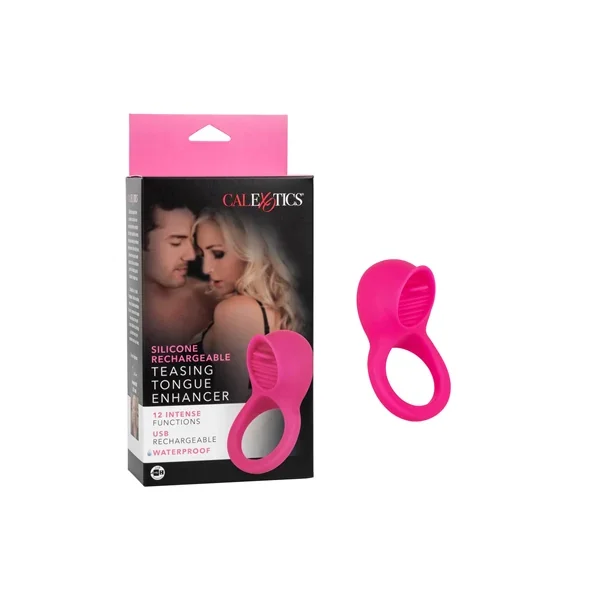 The Silicone Rechargeable Teasing Tongue Enhancer uses the perfect mix of 12 functions of vibration with a flickering teaser ring to deliver double the knee-shaking pleasure. The stretchy stimulator ring is made to intensify pleasure for both beginners and erotic experts alike. The plush body-safe Silicone ring works to improve stamina and girth to make your lover moan for more, more, more. The tight ring maximizes sensitivity and elevates sensation throughout the penis, letting men enjoy longer, more powerful pleasure. As you reach the next level of pleasure, the 12 vibration functions and flickering tongue-like teaser will leave your lady in a state of orgasmic bliss. Ladies, while his pleasure increases, so will yours! The ergonomically shaped stimulator and fluttering tongue-shaped teaser envelopes your most sensitive sweet spots.Take this waterproof ring for a dip and embrace those powerful vibrations in the bath, shower or hot tub. This passionate cock ring remembers exactly how you like it with the state-of-the-art memory chip and can pick up on the last function used. Use the easy push-button control to effortlessly control pleasure. Explore up to 75 minutes on low speed or 50 minutes on high speed vibrations with the single push-button. Recharge your pleasure in only 1 hour with the provided USB charging cable.