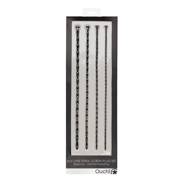 Ouch Silicone Spiral Screw Plug Set Beginner Urethral Sounding Black from Shots Toys. Ouch! Introduces a new line of toys for urethral explorers! If urethral sounding is your kink, then let these smooth probes deliver the ultimate pleasure! The urethra is lined with super sensitive nerve endings, which can be extremely pleasurable when stimulated. Additionally, deep urethral play is the only way to directly massage the prostate. Ouch! Has a variety of urethral sounding probes for beginners as well as advanced users! This set of 4 twisted extra long probes have smooth pointed tips for easy insertion. The flat rounded head allows for safe and easy extraction. Made from super smooth medical grade, phthalate free silicone these probes have a total length of 6.1 inches to go extra deep! They have an insertable length of 11.65 inches and 4 different diameters measuring 0.12 inch, 0.16 inch, 0.2 inch and 0.24 inch. Always use with a generous helping of sterile water based lubricant and insert slowly and incrementally for maximum pleasure.