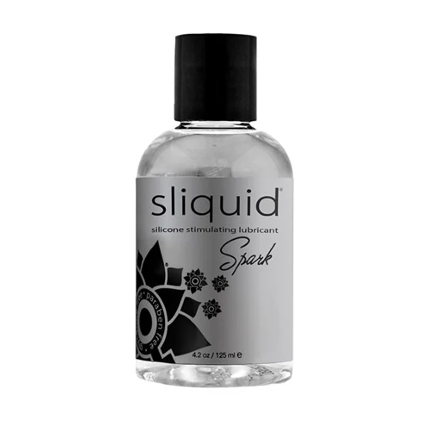 Sliquid Spark Booty Buzz Stimulating Silicone Lube 4.2 fluid ounces. Sliquid Spark is a pharmaceutical grade silicone personal lubricant. It is Sliquid’s Premium formulation infused with menthol. Super long lasting and 100% waterproof, it is the perfect choice for those who need a lubricant to last. Made from an ultra concentrated blend of pharmaceutical grade silicones, Sliquid Naturals Spark will last for hours with only a few drops, and is easy to clean up with simple soap and water: except from some sheets and clothing!. All Sliquid products are formulated by sensitive women, for sensible women.
