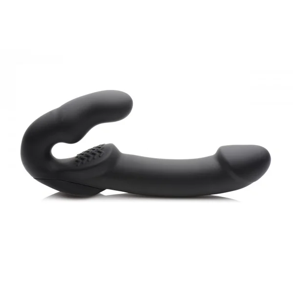 Strap U Evoke Rechargeable Vibrating Silicone Strapless Strap On Black Dildo. Ensure the satisfaction of both you and your lover with an elegant strapless strap on that vibrates! This rechargeable pleasure tool features dual motors with independent control so that you can each take your pick of the 3 speeds and 5 functions of powerful internal thrumming. Both ends of this artfully designed double dildo are shaped for the ultimate in ecstasy: the bulb curves towards your G-spot to pinpoint pressure while you grind your clit against bold grooves. Meanwhile your partner will be treated to a smooth shaft with a protruding mushroom tip. It is even waterproof so that you can take your play into the shower, bath, pool, and more! Explore greater intimacy with a vibrating double ended strap on dildo. Made of silky silicone, the Evoke is non-porous and phthalate free. Clean with mild soap and warm water and avoid use with silicone lubricants. Measurements total length is 9.75 inches in length. Shaft is 6.25 inches insertion length, 1.6 inches at widest diameter. Bulb is 4 inches insertion length, 1.5 inches at widest diameter. Material Silicone. Color Pink. Note rechargeable vibration via USB.