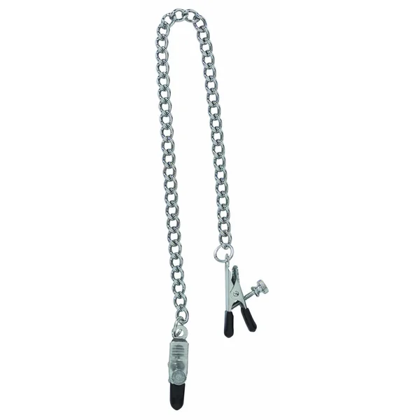 These Tapered nipple clamps deliver a tantalizing pinch that you’ll definitely notice. In the adjustable style, the tapered surface will hold the contours of your nipple as lightly or as tightly as you choose. These adjustable clamps are a great choice for beginners because they’re easily altered to suit the wearer’s comfort level. Simply center the nipple between the rubber tips and sltwist the central bolt up to the desired tightness. The jewel link connector chain keeps the wearer’s sensual focus on the nipples with each movement. A fun toy to enjoy throughout your BDSM experiences, these versatile clamps can be made tighter for more intense play as your play progresses. Color: Silver Type: Nipple Clamps Style: Alligator Material: Metal, Rubber. Special Features: Connecting Chain, Adjustable. Spartacus A Passion for Quality Catalog.
