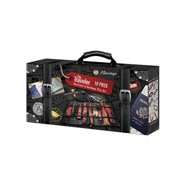 The Traveler 10 piece Restraint and Bondage Play Kit. Includes: Mask, leash, collar, 2 wrist cuffs, 2 ankle cuffs, 2 cuff chains, 2 nipple clamps, ball gag, whip and paddle.