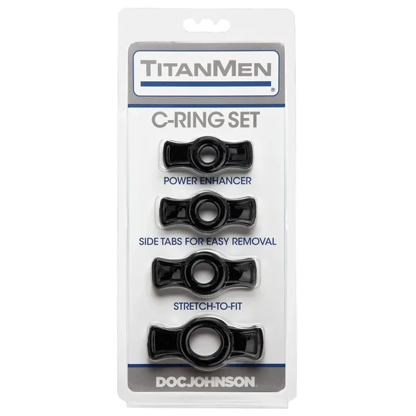 Revolutionary new cock rings with pull tabs on each side for easy on and off. The stretchy TitanMen Cock Ring Set, from Doc Johnson, includes 4 sizes for a variety of possibilities and a customizable fit for every man’s tool.