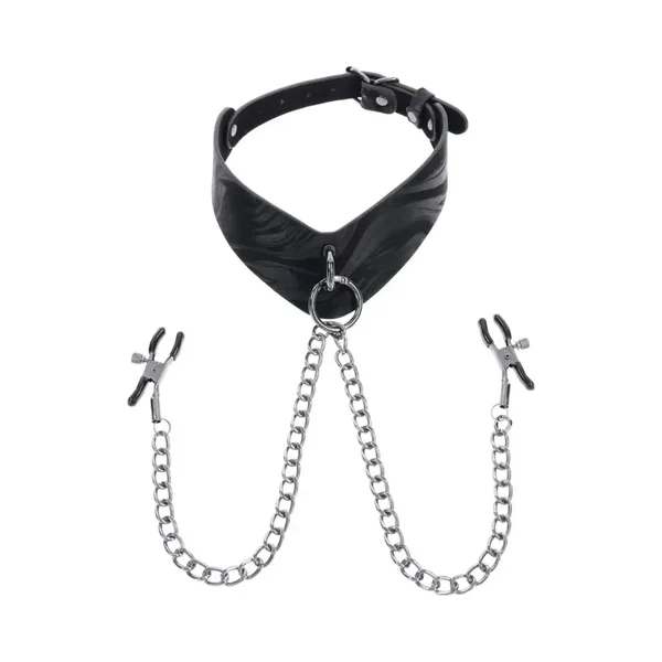 A solitary metal chain links to flexible nipple clips, bringing a hint of flirtation that can be detached for extra flexibility (literally). Wear the choker and clips together, mix in a leash, or rock it solo as a fashionable day choker. Crafted for comfort and adventure, this item invites you to experiment with control on your own terms (and have a good time doing it!).