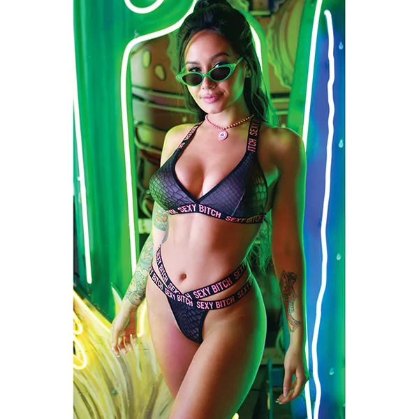 Vibes Sexy Bitch Reptile Print Bralette and Thong Medium – Large from Fantasy Lingerie. Features: microfiber print bralette with adjustable straps and matching strappy panty. Thick adjustable straps. Reptile print. Great as outerwear. Fabric content 95% Polyester, 5% Spandex. Washing instructions hand wash separately in cold water. Do not bleach. Flat dry. Ladies sizes M/L Cups C/D. Bust 34 inches to 38 inches. Waist 28 inches to 31 inches. Hips 36 inches to 40 inches.