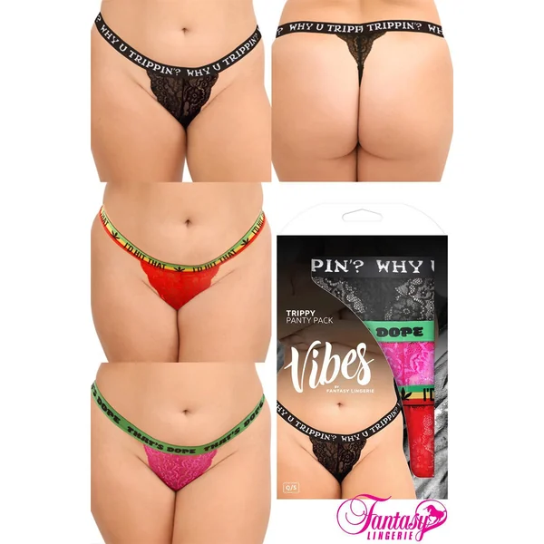 High cut lace G-String with an elastic waistband featuring a bold print and a lined cotton gusset.(3PC Set; all colors and “TRIPPY” prints included in one package)