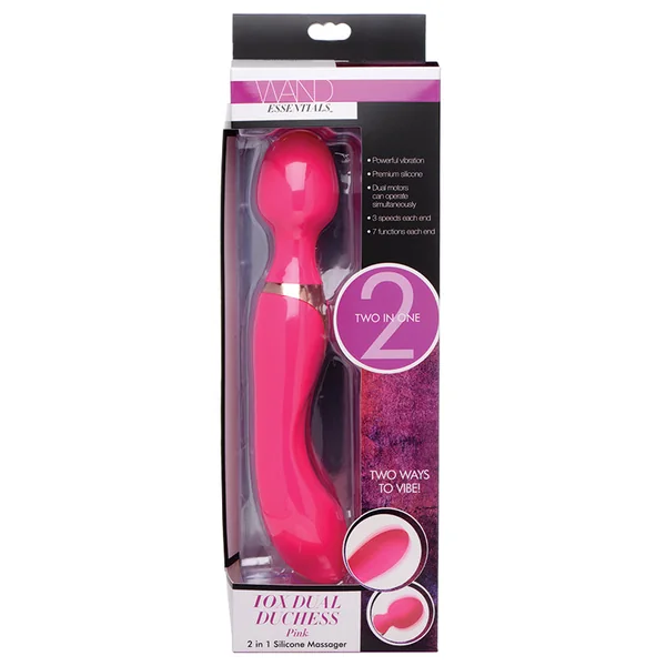 Enjoy both ends of this classy 2 in 1 silicone massage wand! This double ended vibrator comes with a classic massage head with a flexible neck on one end, and a deliciously curved silky smooth vibrating handle for a wider contact area and penetration possibilities!